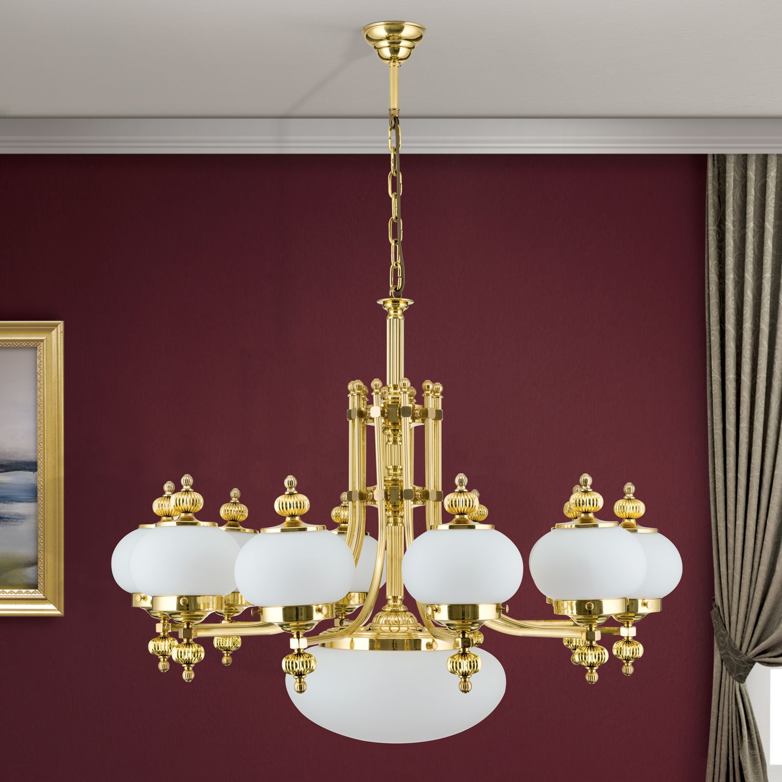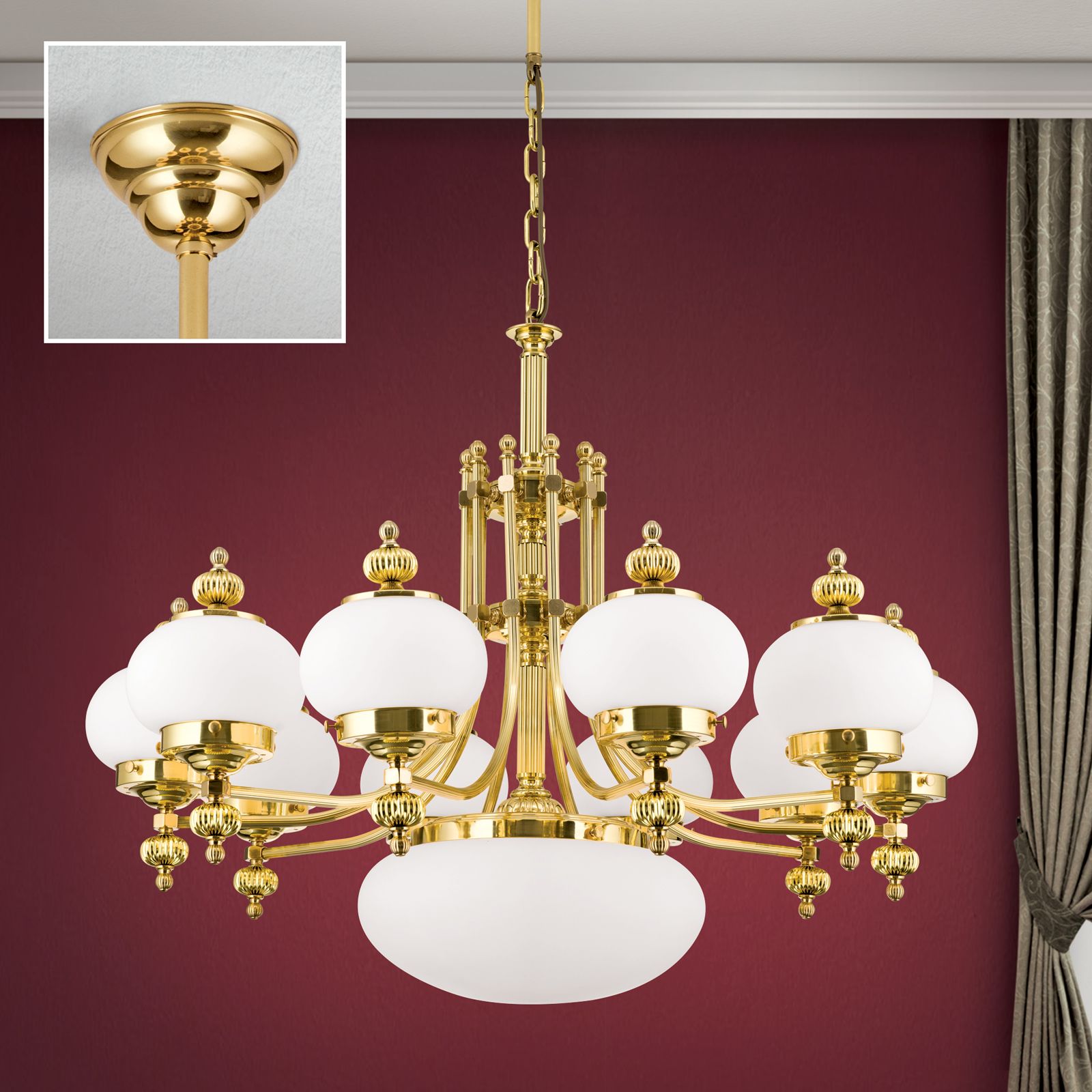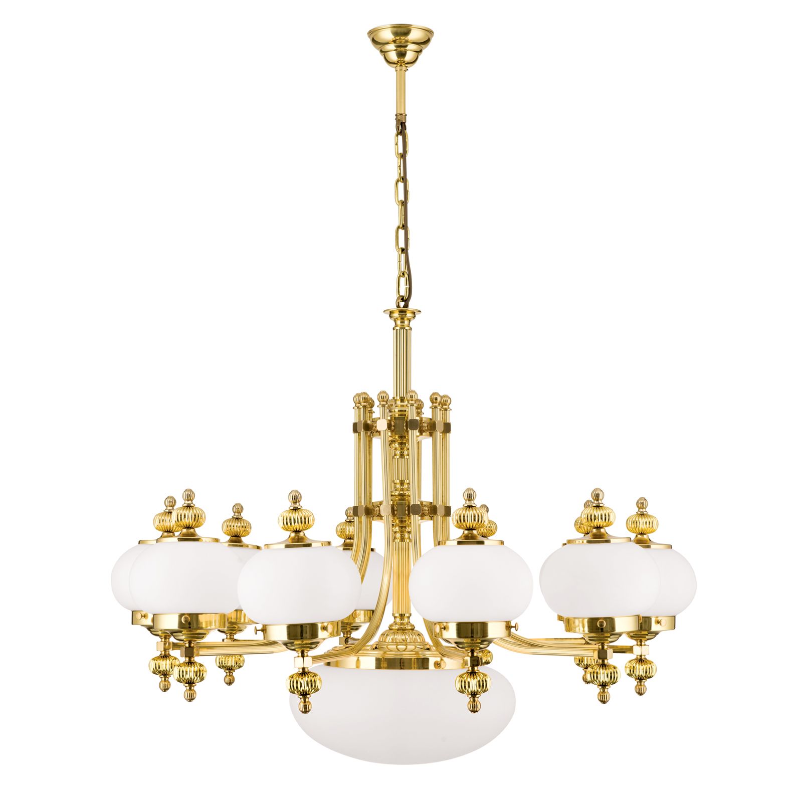 Luster WIENER NOSTALGIE, 10+1-flammig, Messing-glänzend, mit opal matten Gläsern, aufwärts