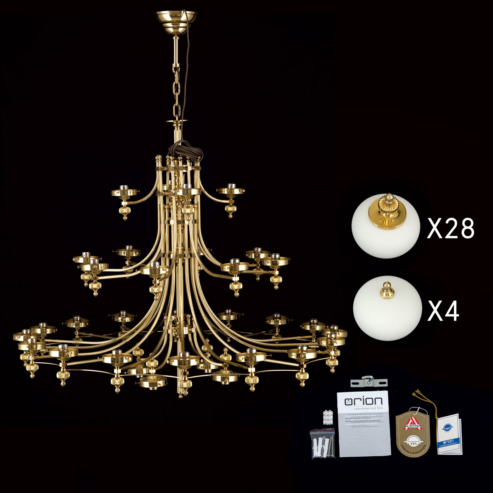 Repräsentationsräume, ob profan oder sakral, profitieren von dem hoch dekorativen und imposanten 32-flammigen Luster aus der traditionellen Serie WIENER NOSTALGIE. Auch in früheren Zeiten waren Kronleuchter vor allem in Kirchen und Palästen in Verwendung - Orte mit enormen Raumgrößen. Wer über derartige Räume verfügt, die mindestens vier Meter hoch und 100 Quadratmeter groß sind, benötigt ohnedies viel Leuchtpower und ist mit diesem Luster bestens versorgt. Die Anordnung der oberen drei Stöcke mit aufwärts scheinenden Lampen und der untersten Reihe, die abwärts leuchtet, gewährleistet eine gleichmäßige Ausleuchtung des gesamten Raumes. Auch prächtige Stiegenaufgänge lassen sich mit diesem Luster hervorragend beleuchten. Der Luster ist mit 32 E27-Fassungen zu je maximal 60 Watt ausgestattet.
