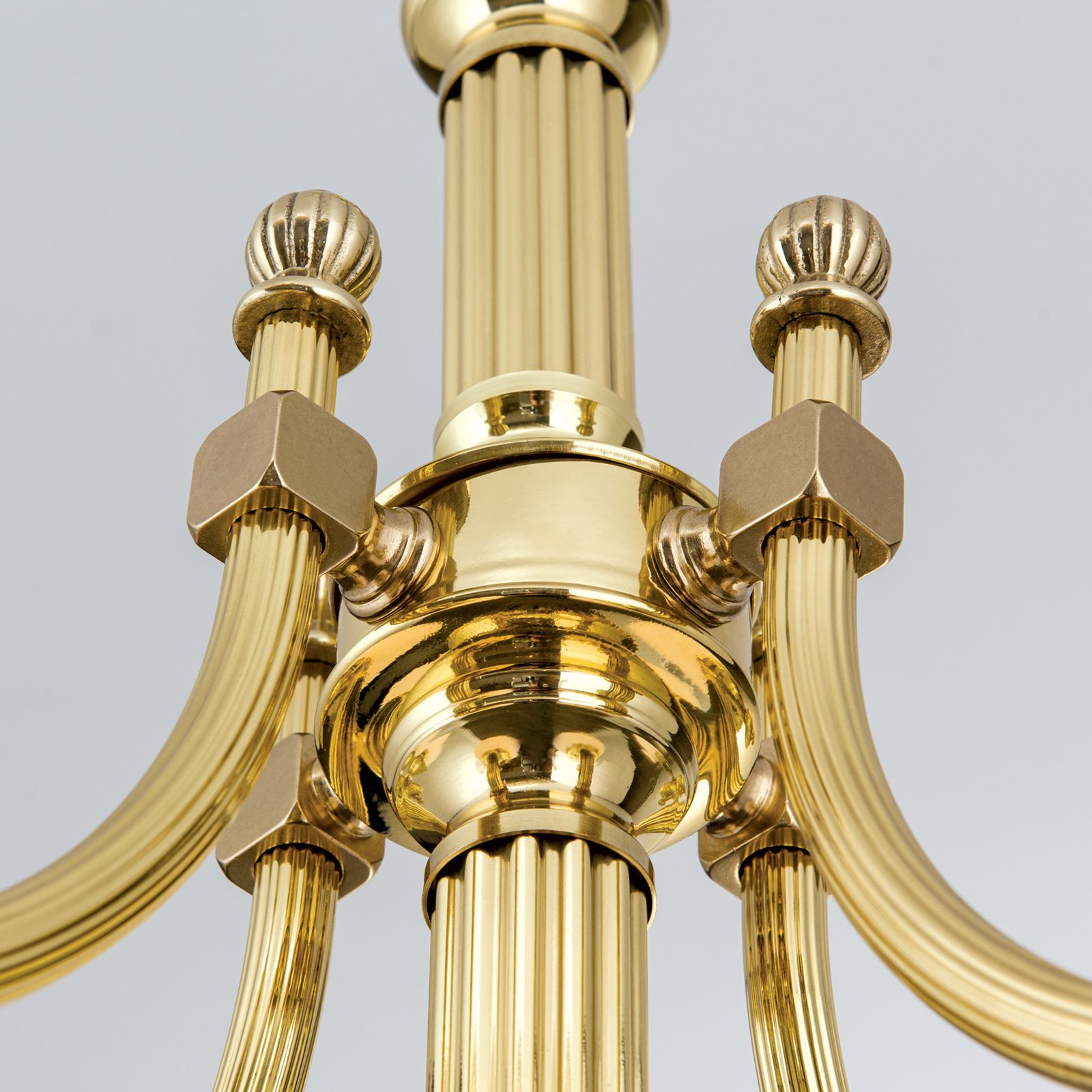 Dieser Kronleuchter ist auch in einer Version in Patina mit champagne matten Gläsern verfügbar.