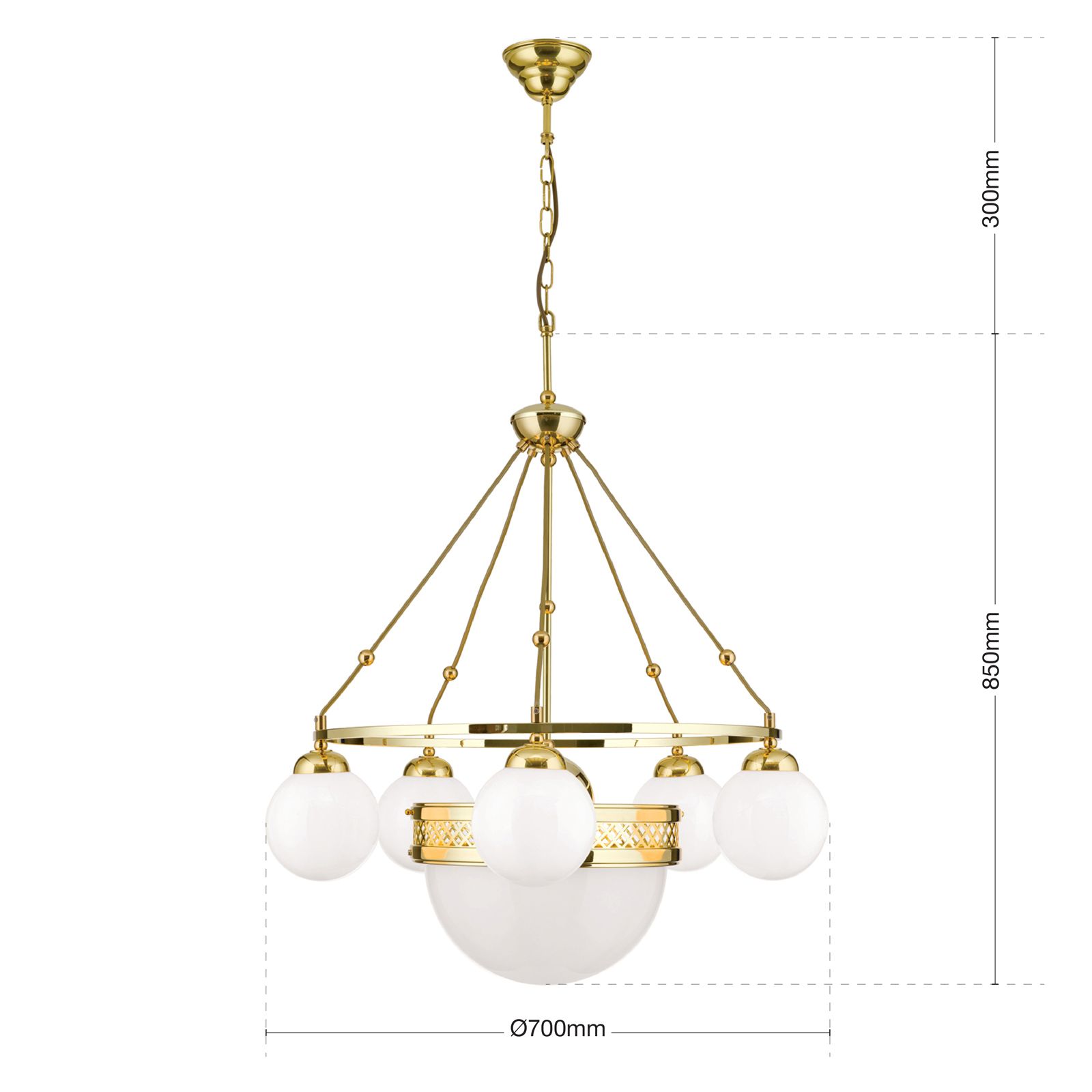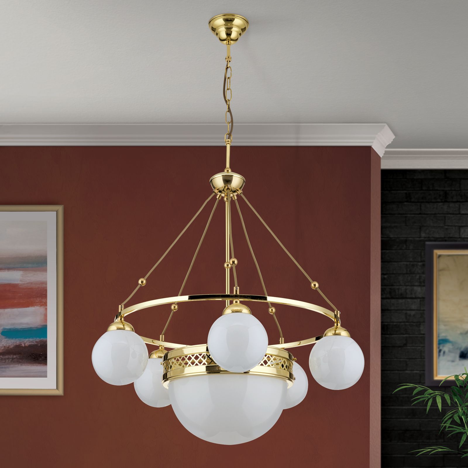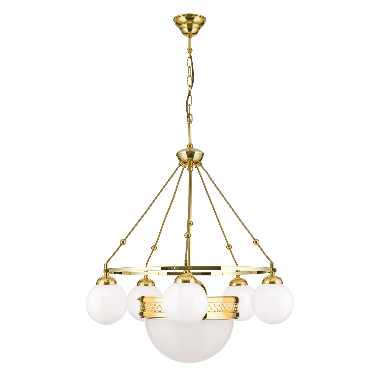 Pendelleuchte ALT WIEN, 5+1-flammig, Messing glänzend, mit opal glänzenden Gläsern