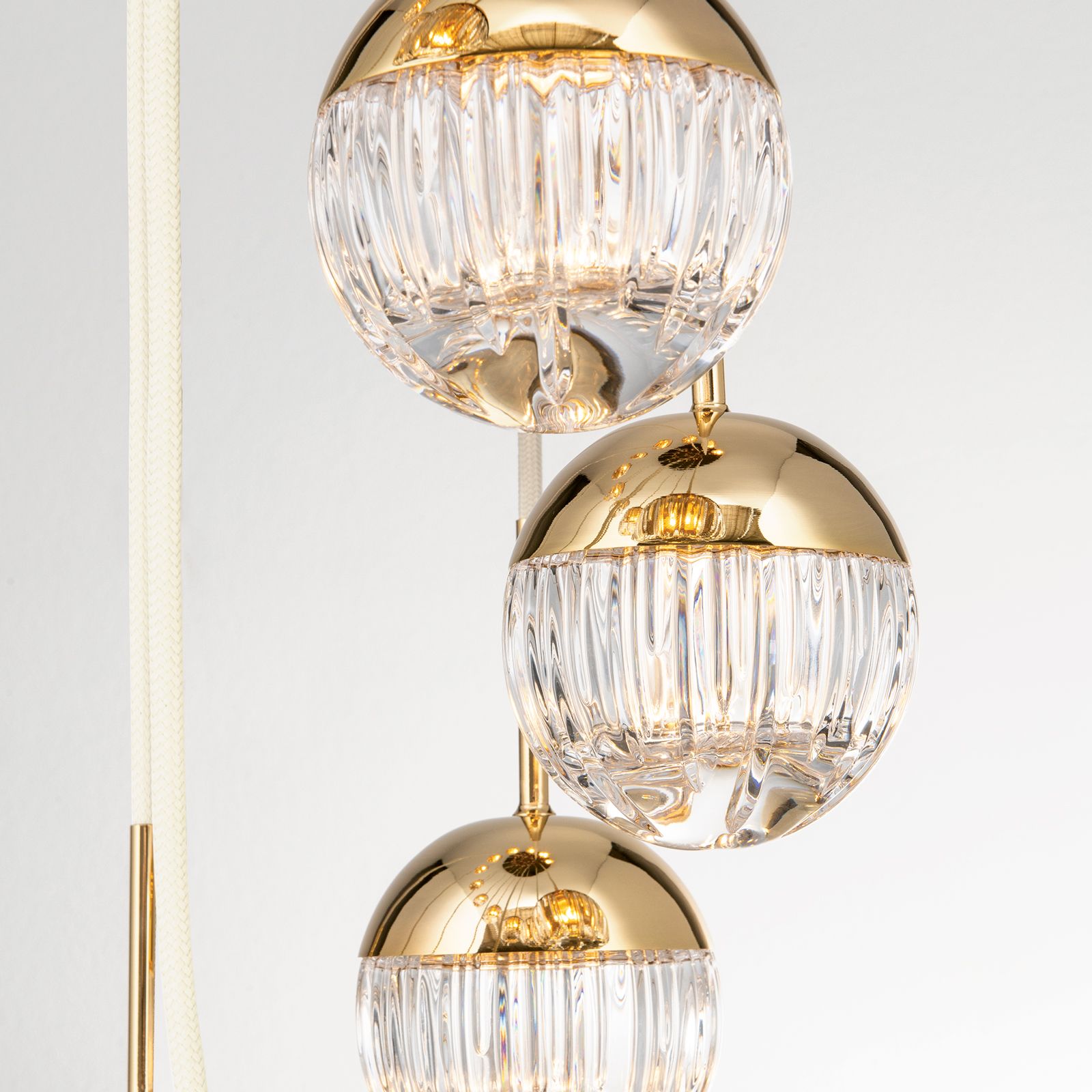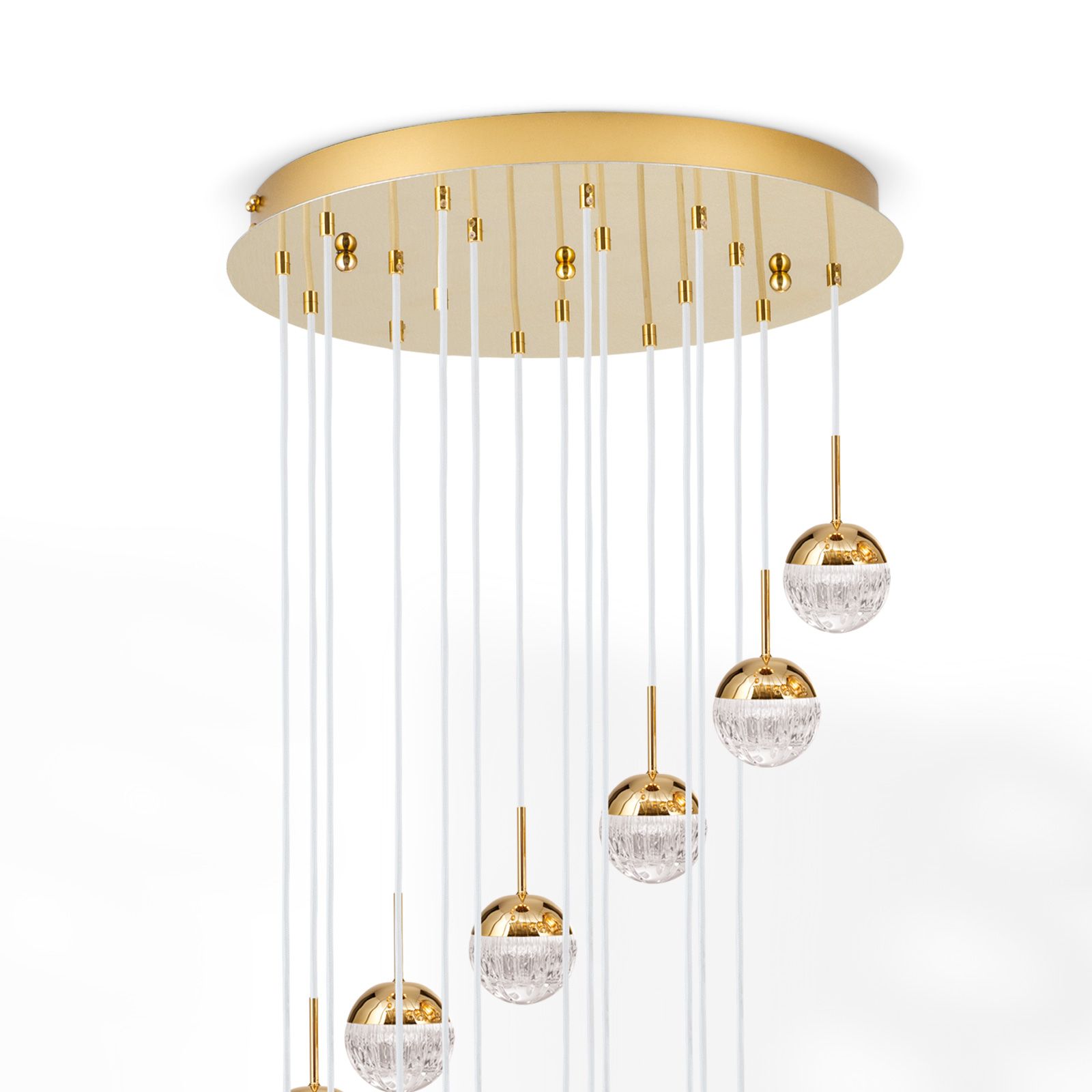 Spiralluster BALL, Ø 60cm, gold, mit weißem Textilkabel und klaren Kristallgläsern in Linienschliff