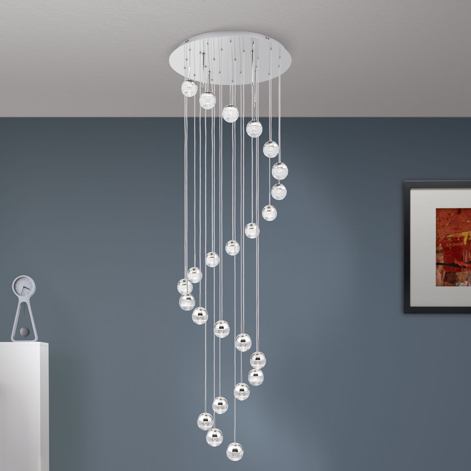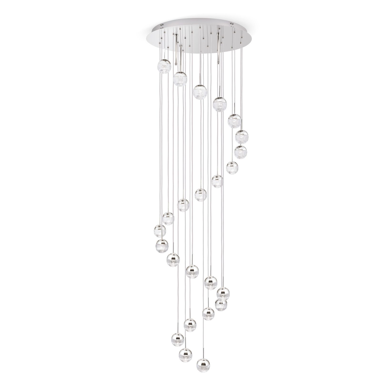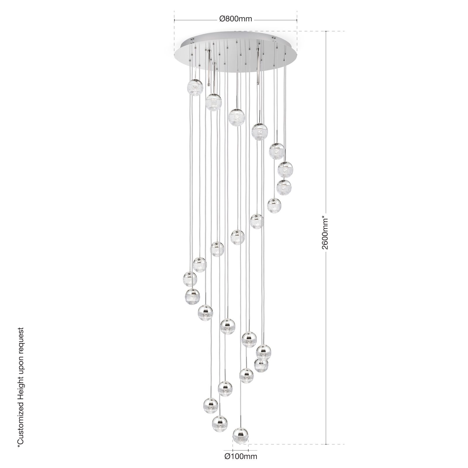 Schwungvoll und verspielt präsentiert sich die eindrucksvolle Spirale aus 24 Kristallglaskugeln des Lusters BALL. Ausgehend von einem runden, verspiegelten Baldachin sorgen hochwertig verarbeitete Textilkabel für die Verbindung zu den eleganten ORION Hochbleikristallgläsern, die klar strahlen. Der im Diamantschliffverfahren hergestellt Linienschliff sorgt für faszinierende Lichtbrechungen und ein facettenreiches Funkeln.