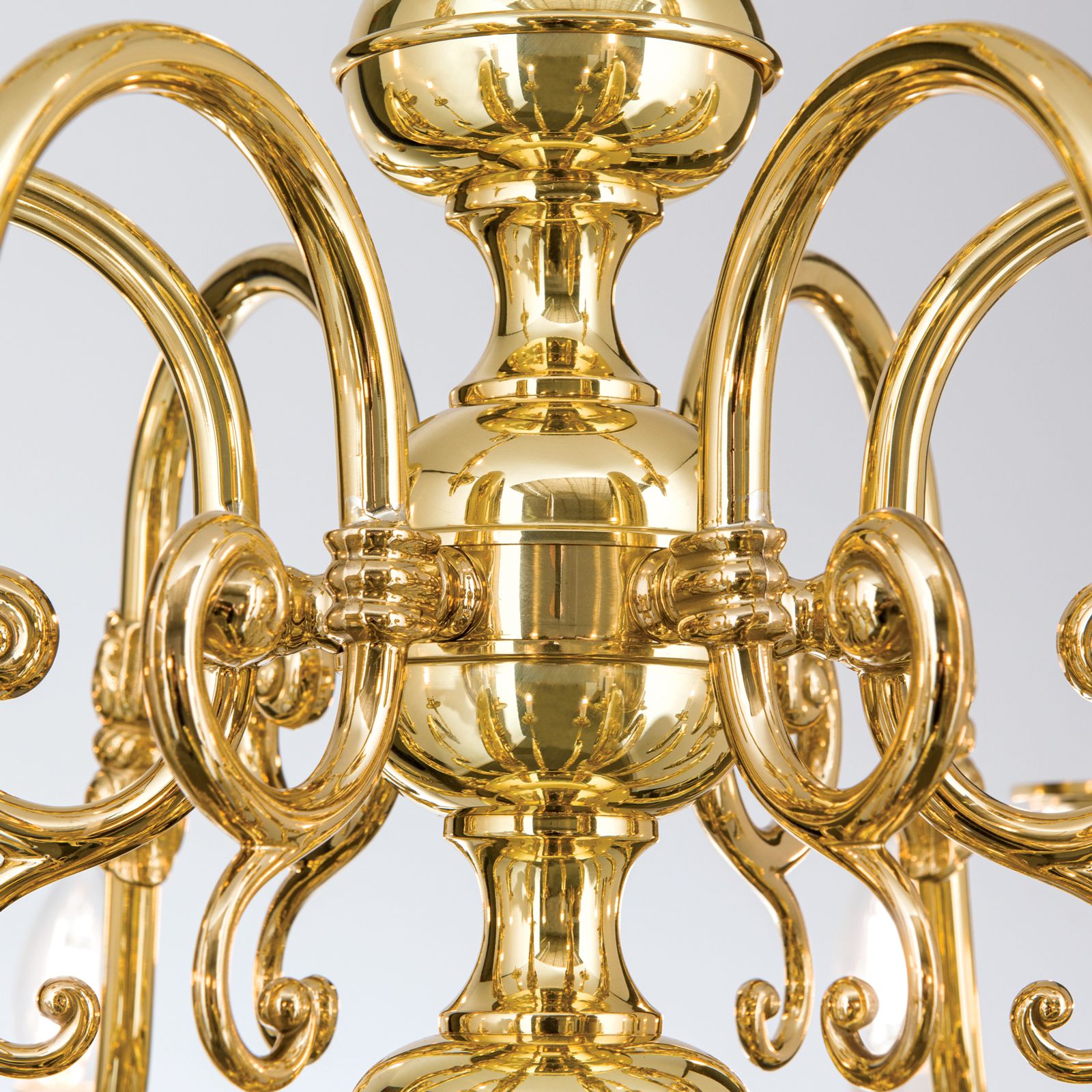 Der Stilluster aus der FLÄMISCH-Reihe ist ein Paradebeispiel für Ausgewogenheit: eine mathematische Reihe - 3-6-12 - bestimmt die Anordnung der Flammen, erwirbt aber gerade durch diese Strenge eine emporstrebende Leichtigkeit. Die Geometrie der Armbogen entwickelt eine schwungvolle Dynamik, die Zurückhaltung in der Ornamentik lässt die dezenten Zierelemente - Voluten, Ranken, Profilierung des Schaftes und der Deckenrosette - umso mehr strahlen. Die imposanten Ausmaße des Lusters mit einem Durchmesser von mehr als einem Meter und einer Abhängung von 166 Zentimetern sind geeignet, einen 60 Quadratmeter großen Raum mit ausreichend Licht zu versorgen. Der Luster verfügt über 21 E14-Fassungen für je maximal 40 Watt.
