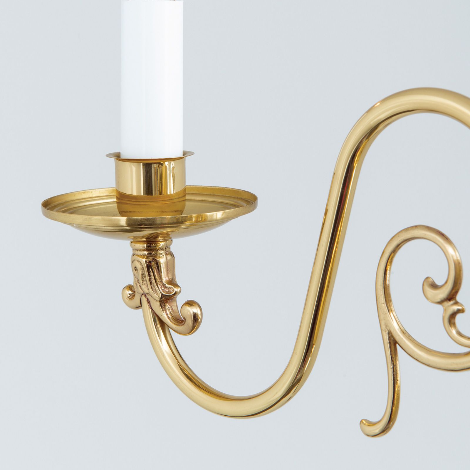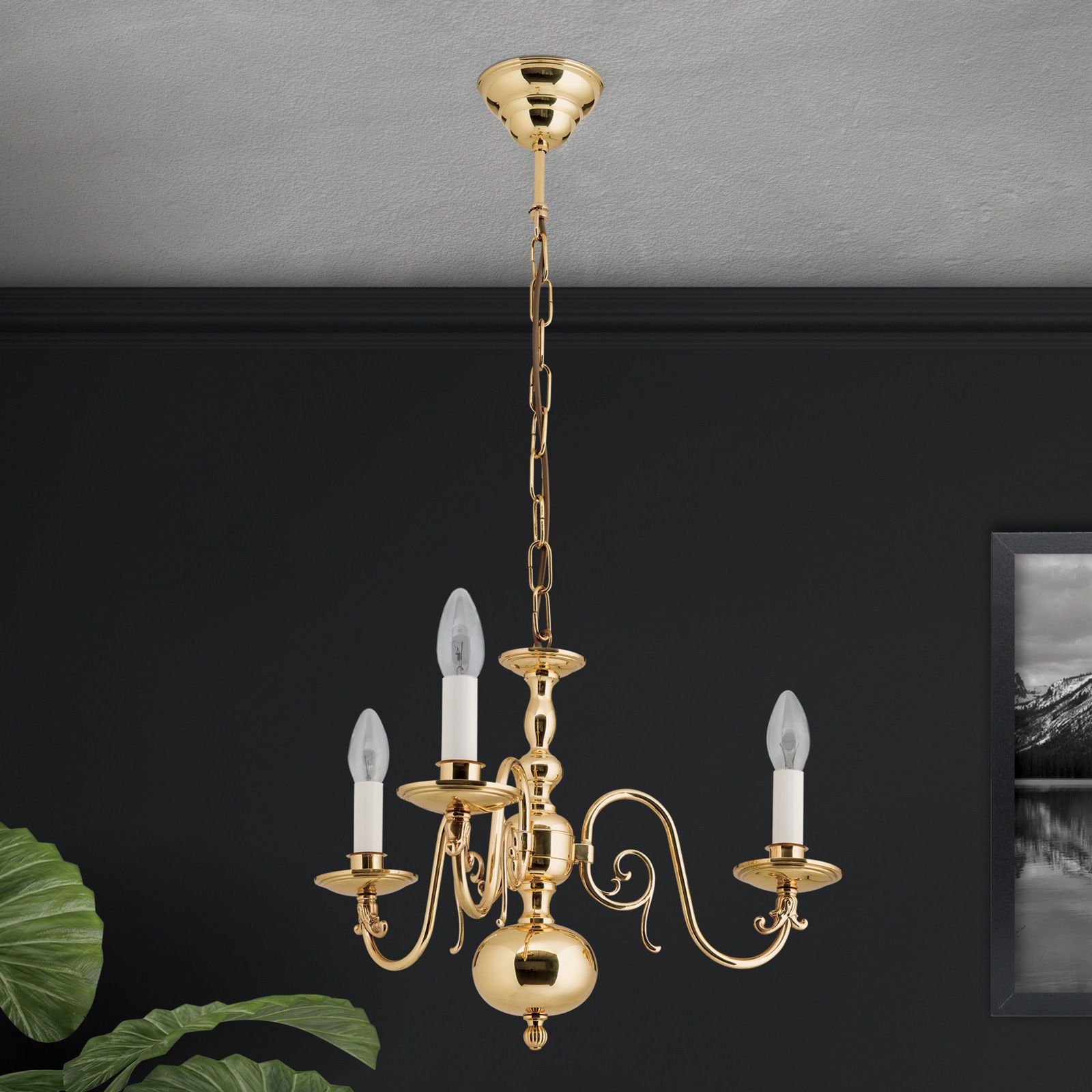 Der 3-flammige Kronleuchter aus der Reihe FLÄMISCH hat genau die richtigen Dimensionen und die nötige Lichtkapazität, um einen kleinen Raum, etwa ein Schlafzimmer, zu beleuchten. Die drei Flammen erzeugen eine heimelige, intime Stimmung, der Messingkörper mit seinen feingliedrigen Armen spielt mit den Lichtreflexen. Entschließt man sich zum Einsetzen von Windstoßlampen, begibt man sich atmosphärisch auf eine Zeitreise in die Epoche eines Rubens, Vermeer oder Rembrandt. Eine Einrichtung mit warmen Farbtönen viel Holz und Stoff, wird durch diesen Luster hervorragend ergänzt. Der Stilluster liefert mit drei E14-Fassungen je bis zu 40 Watt.