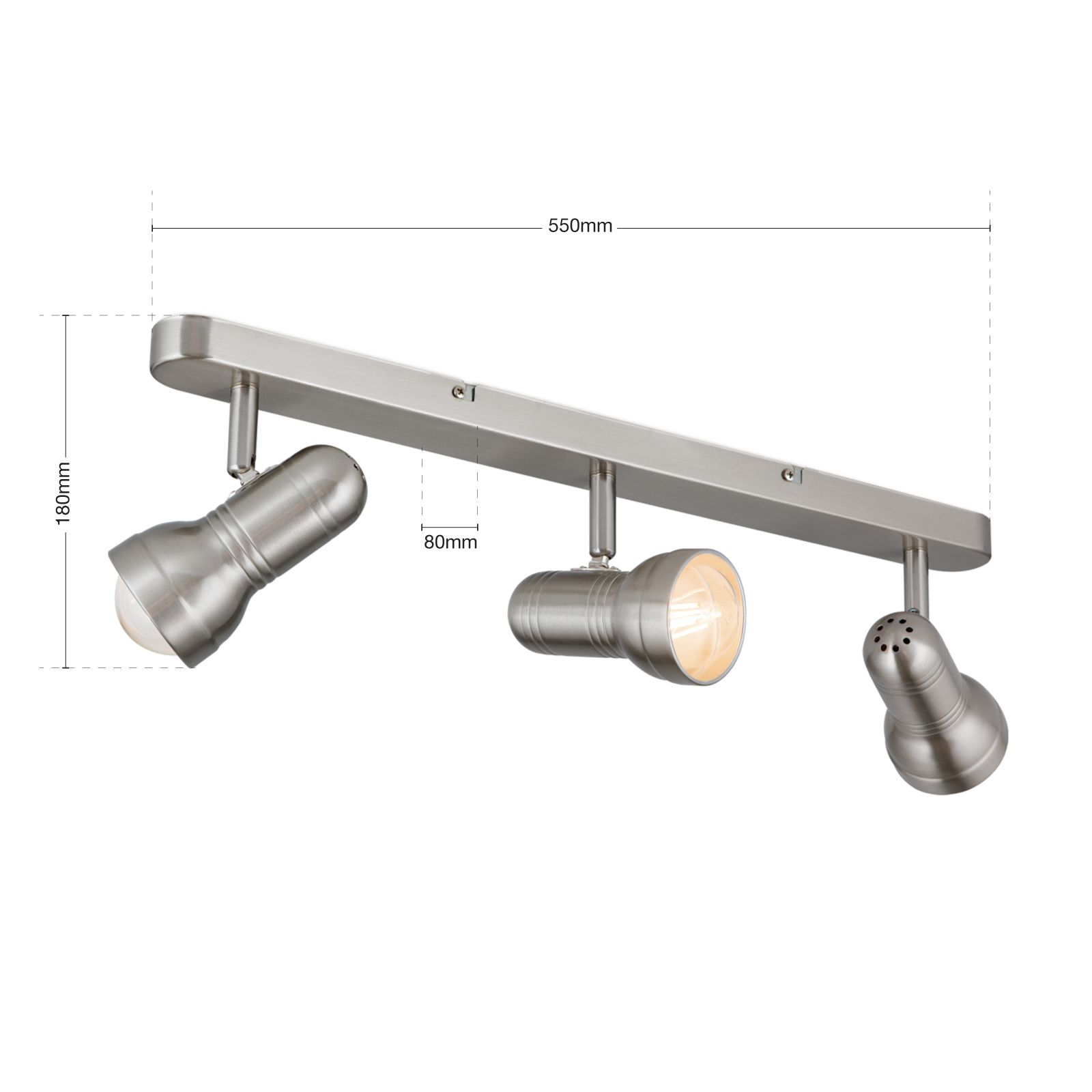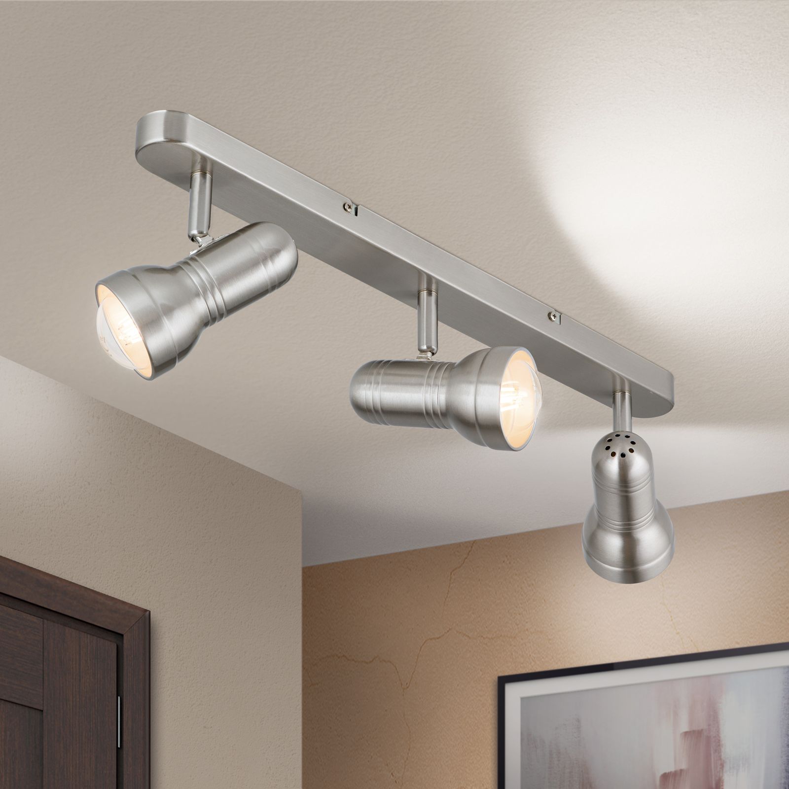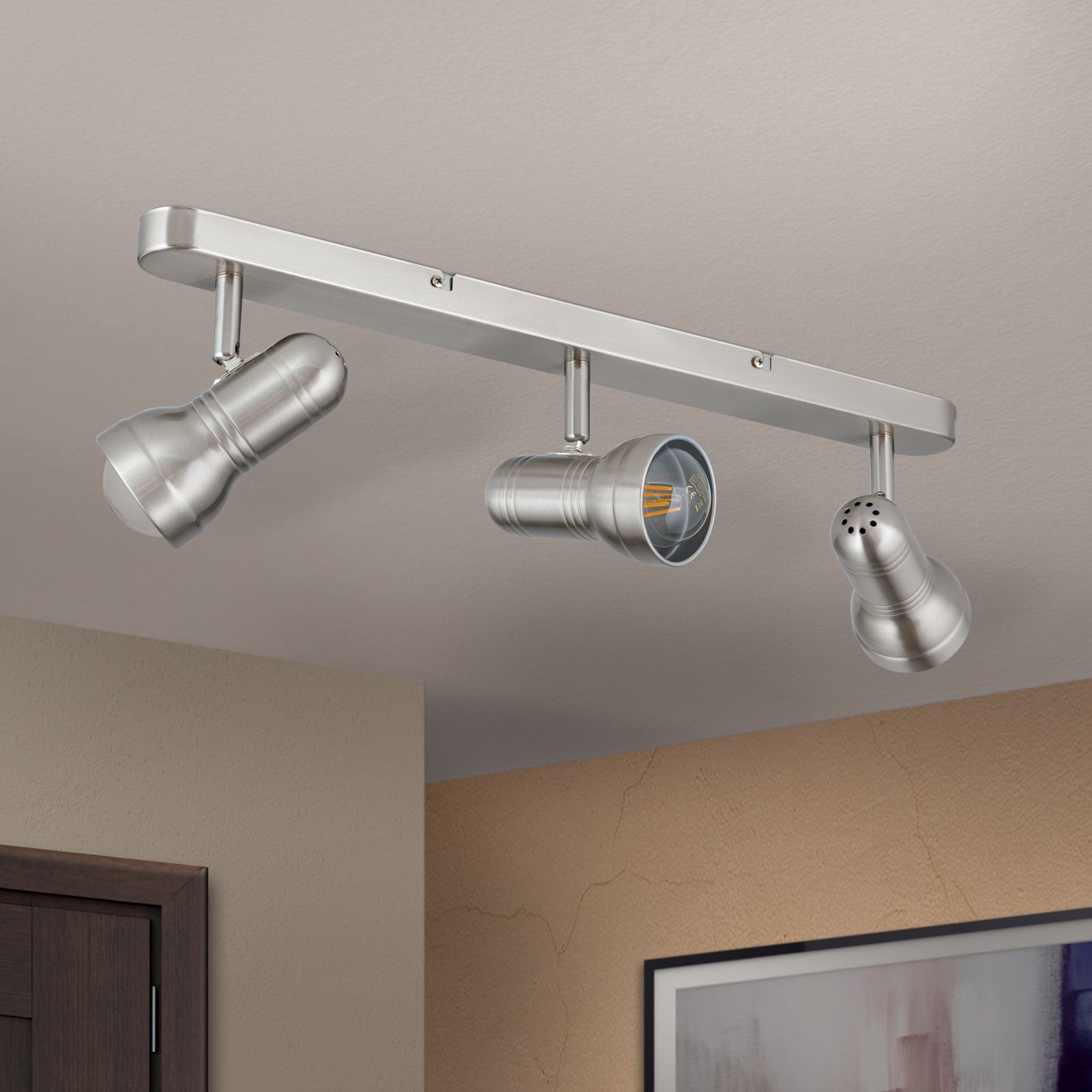 Die Satin/Nickel-matte Oberflächenveredelung rundet die hochwertige Verarbeitung des Strahlers ab. Drei E27-Fassungen für je maximal 60 Watt-starke Leuchtmittel bieten ausreichend Power für jede Wahl der Raumausleuchtung. Wird die Leuchte mit sparsamen LED-Lampen betrieben, kann man sich am Ende des Monats auch an einer Reduktion der Energiekosten erfreuen. Matte LED-Lampen in Tropfenform mit einem E27-Sockel sind die idealen Leuchtmittel für diesen Strahler.