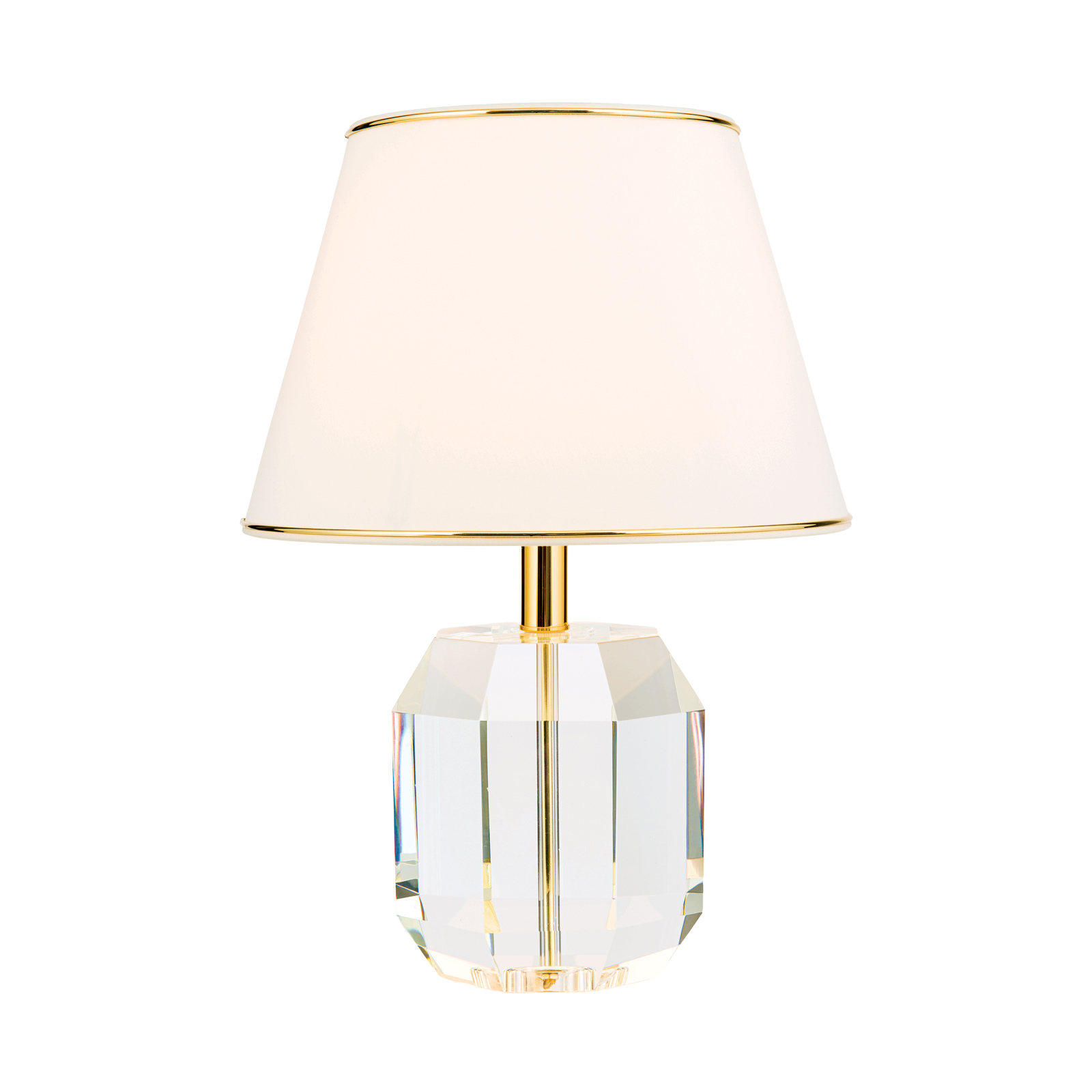 Besonders schick im Erscheinungsbild präsentiert sich die Tischlampe ALEXIS mit ihrem außergewöhnlichen Standfuß. In klassisch oder modern eingerichteten Interieur lässt sich ein Platz auf einer Anrichte oder einem frei stehenden Regalbrett für ALEXIS durchaus einrichten und dort alle Blicke auf sich ziehen. Der Standfuß erinnert an ein übergroßes Schmuckstück, welches aus K9 Kristallglas gefertigt ist. Dadurch ist die sich darin befindliche Säule der Leuchte sichtbar. Beim Einschalten der Leuchte wird die glänzende Oberfläche reflektiert und durchflutet den Kristall mit einem bezaubernden Licht. Zarte goldene Streifen zieren den kegelförmigen Schirm und runden das Gesamtbild ab. Ausgestattet mit einer E27-Fassung wird ALEXIS mit maximal 60 Watt betrieben.