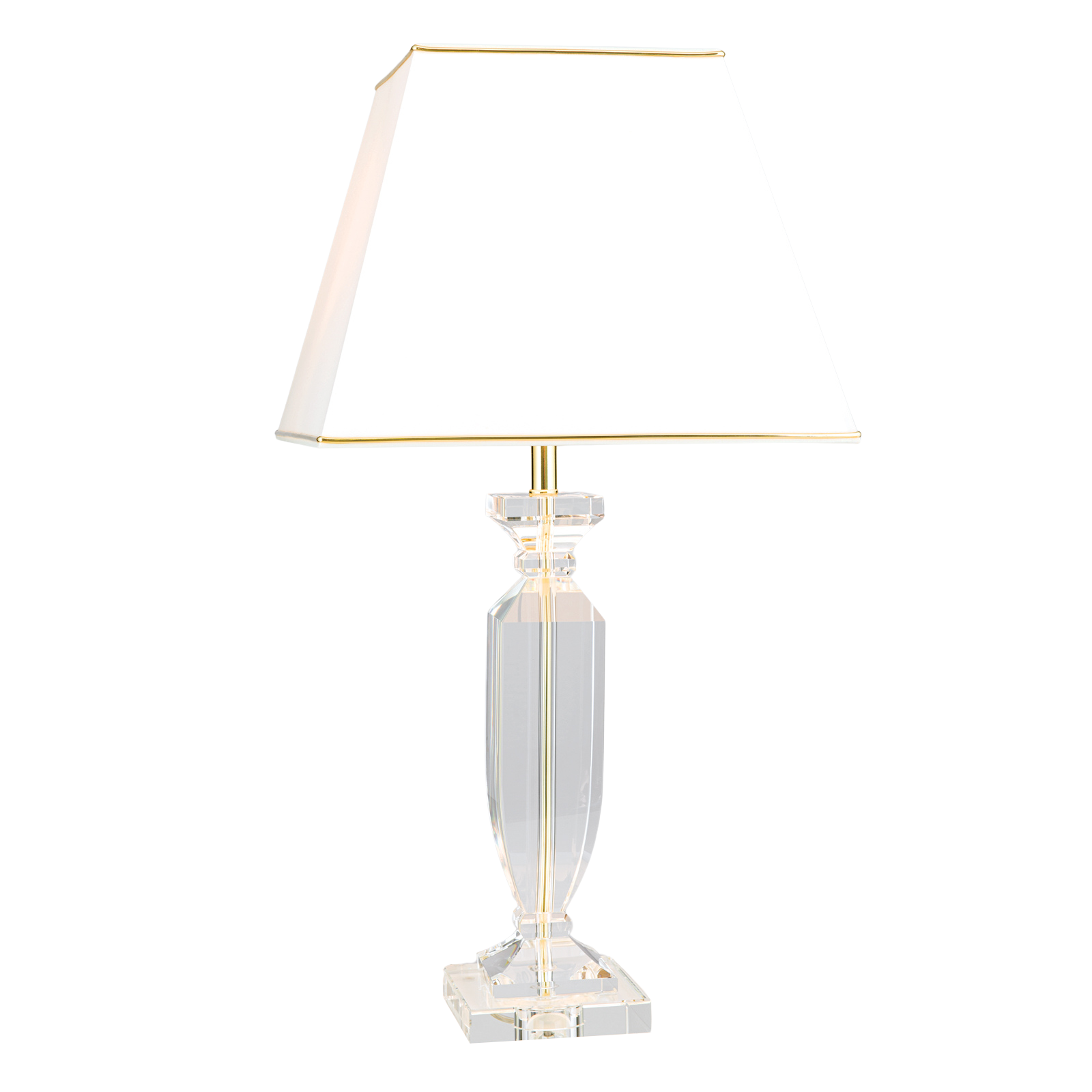 Die Tischlampe POKAL überzeugt mit ihrem außergewöhnlichen Erscheinungsbild. Auf einer Kommode im Vorraum oder Wohnzimmer fungiert sie als dekoratives Leuchtobjekt und wird alle Blicke auf sich ziehen. Die Säule in einem goldenen Oberflächenfinish wird von formschön geschliffenen K9 Kristallglas ummantelt, welcher sich durch seine Leichtigkeit und hohe Qualität auszeichnet. Ein trapezförmiger Schirm rundet das Gesamtbild ab und wird durch einen dezenten goldenen Streifen, welcher sich ober- und unterhalb des Schirms befindet, geziert. Durch den Lichteinfall auf die goldene Säule durchflutet den klaren Kristall ein goldiger Farbton. Mit maximal 60 Watt kann die 1 E27-Fassung betrieben werden. Sollte Sie sich für sparsame LEDs entscheiden, wird POKAL zu einer energieeffizienten Beleuchtung.