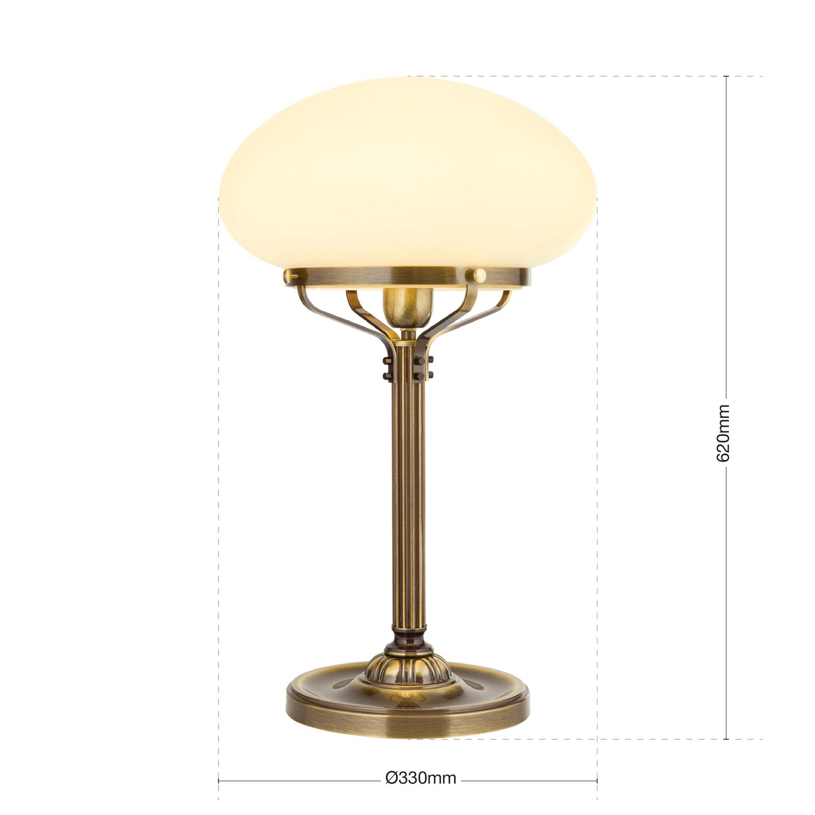 Bei der Tischlampe aus der Klassikerserie WIENER NOSTALGIE handelt es sich um ein Kleinod aus der Formenwelt des Jugendstils. Klare Linien von zeitloser Leichtigkeit verbinden sich mit einem Höchstmaß an Funktionalität. Der scheibenförmige Fuß geht in eine kannelierte Säule über. Diese teilt sich in vier Streben und geht wieder in einen Kreis, die Ringeinfassung des Schirmes über. Das Glas ist nicht Kreis, nicht Ellipse, sondern eine Summe von himmlisch schönen Rundungen. Auf einem Tischchen neben einem Lehnstuhl, auf einer Kommode oder einem Esstisch: Diese Leuchte ist Licht- und Freudenspender zugleich. Die Tischlampe ist mit einer E27-Fassung für bis zu 60 Watt versehen.