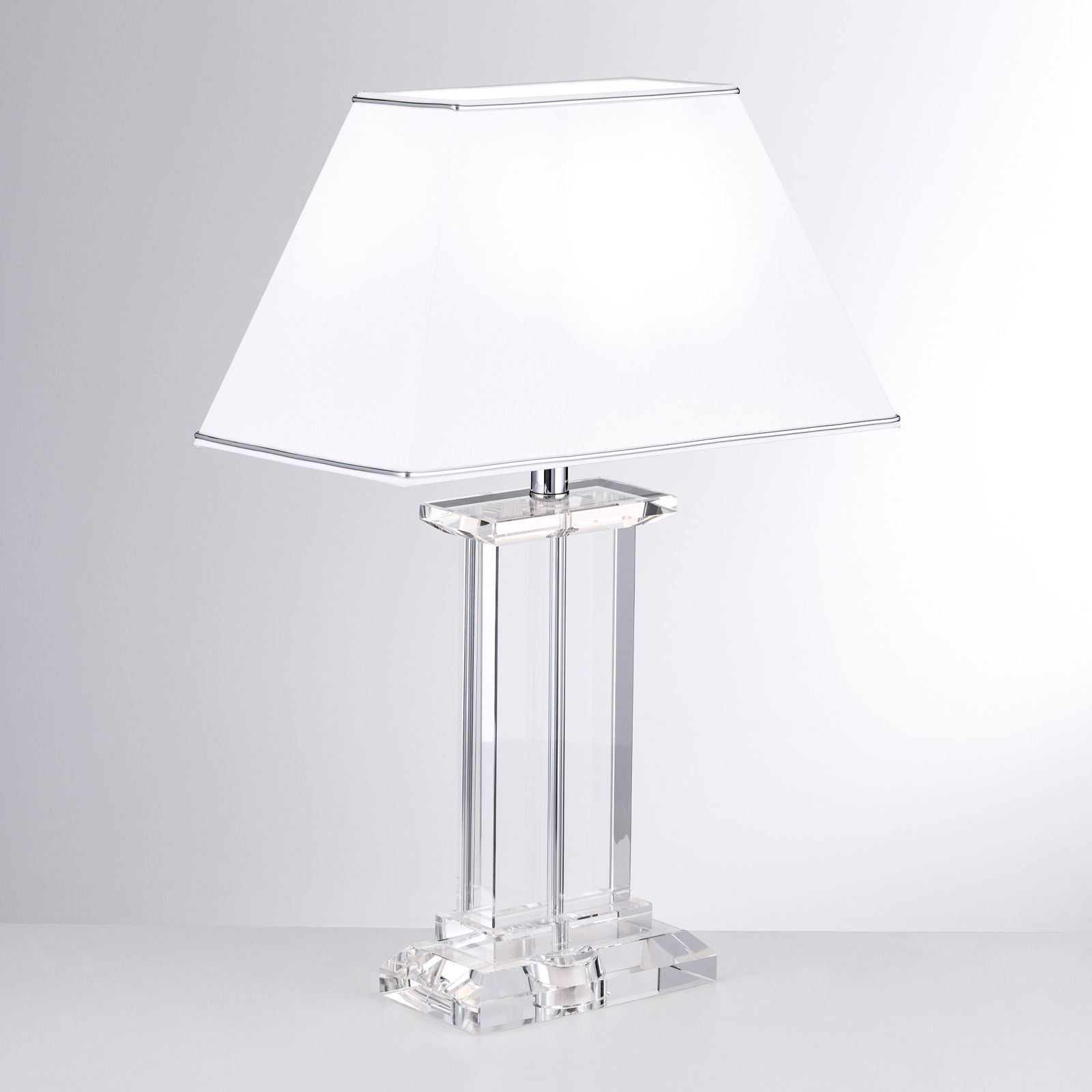 Die Tischlampe VERONIQUE überzeugt durch ihre klaren Linien und die Kombination aus einem Gold bzw. Silber eingefassten hellen Lampenschirm und transparentem Kristallkörper.