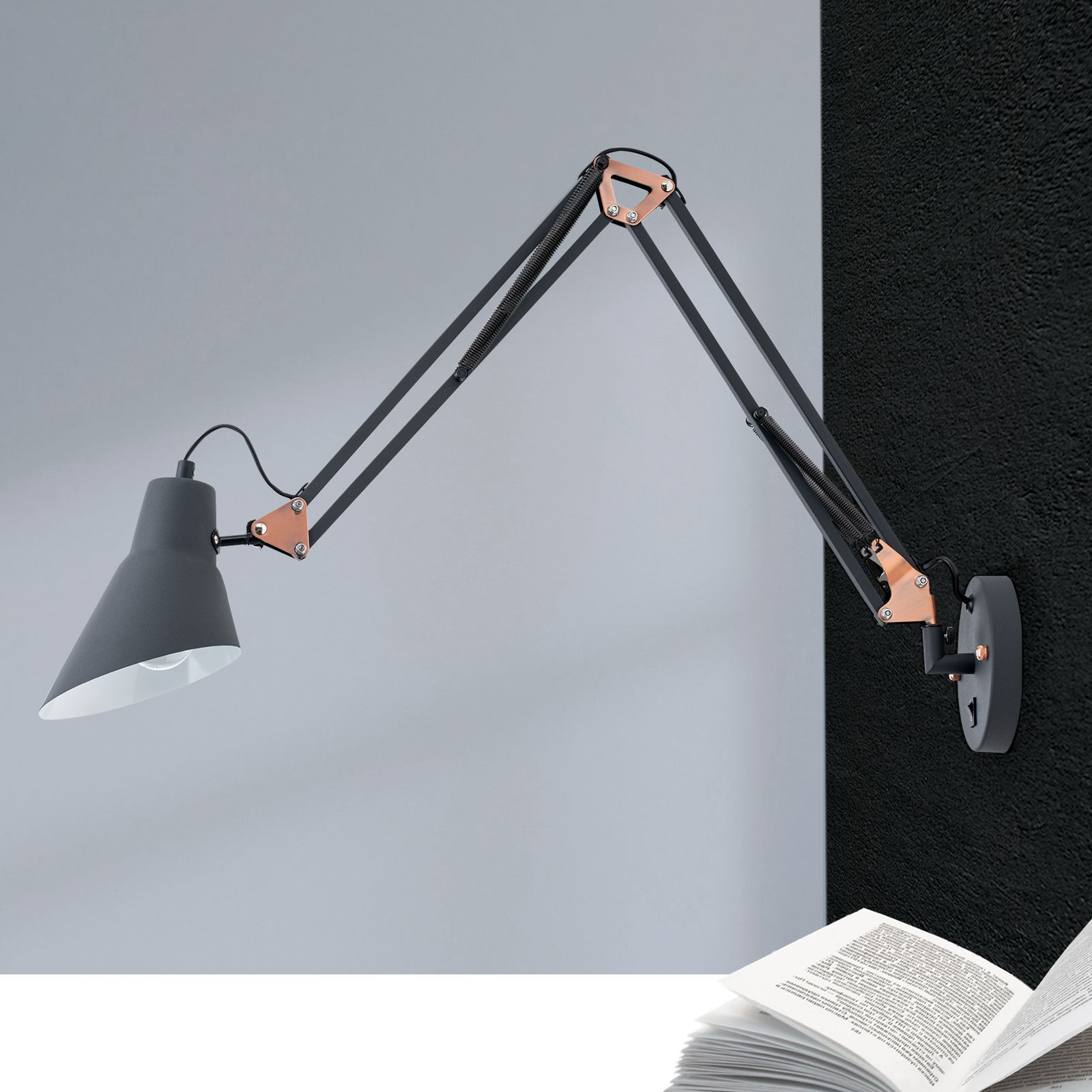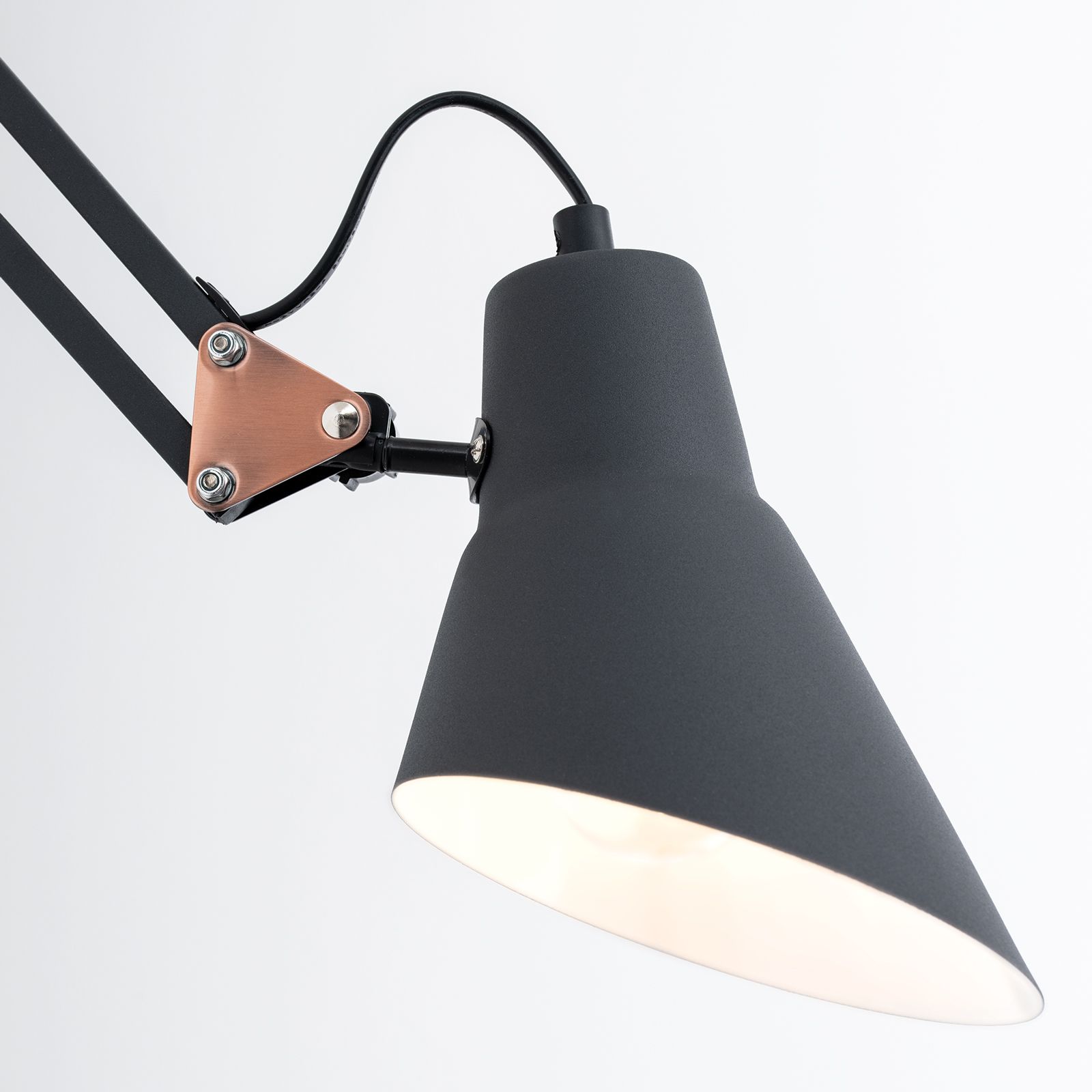 Die trendige Wandleuchte BACHELOR besticht nicht durch ihre Kombination aus klassischen Design und modernem Finish. Ihre Grundform geht auf die britische Designikone der 1930er-Jahre zurück. Die mattschwarze Pulverbeschichtung und kupferfarbene Gelenke entsprechen den aktuellen Trendfarben.