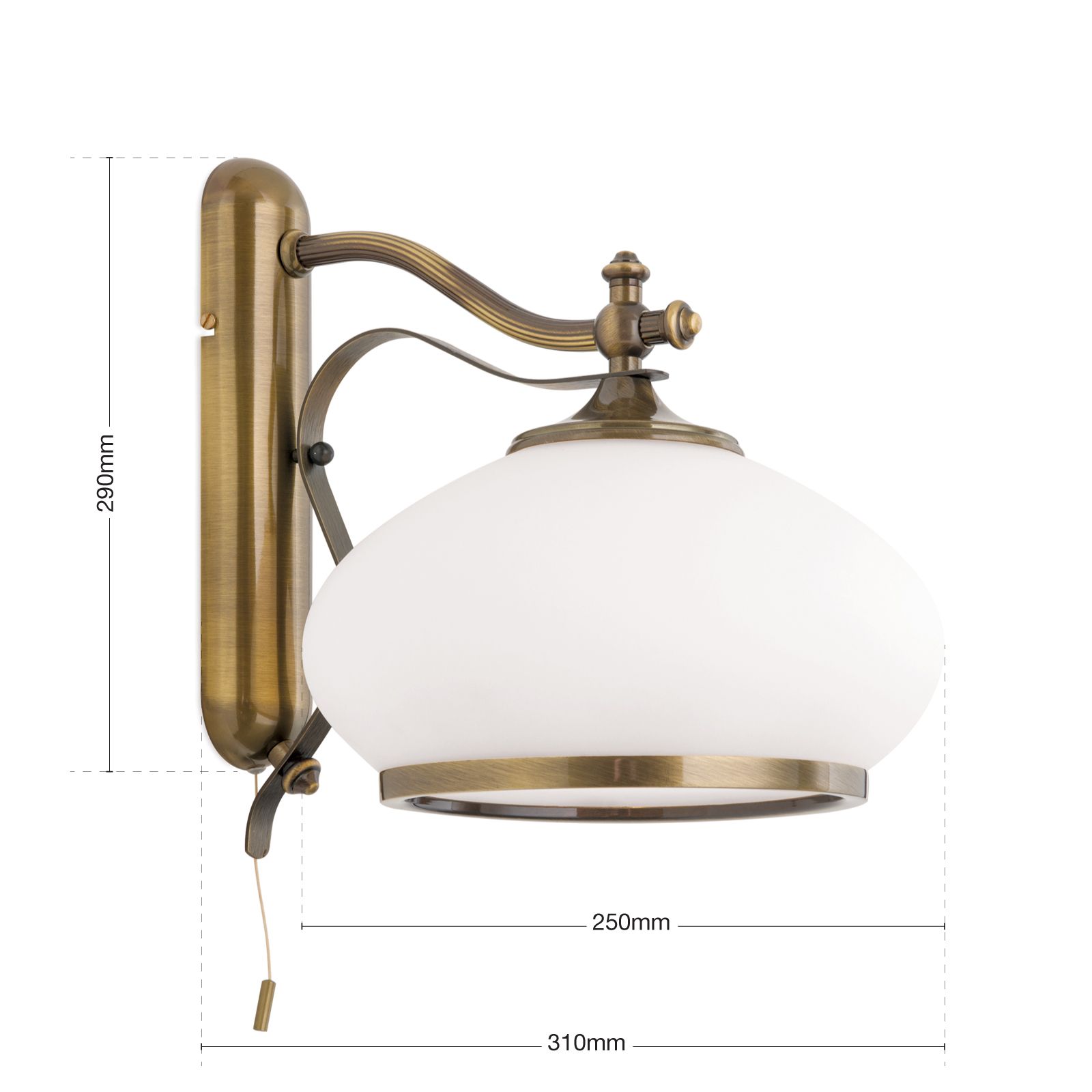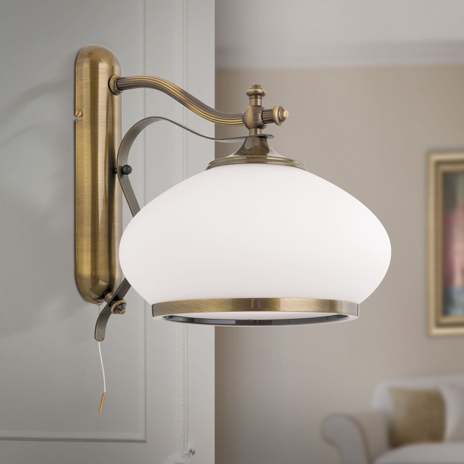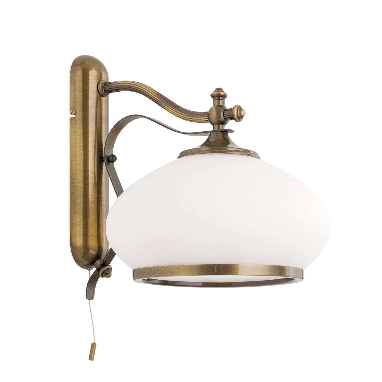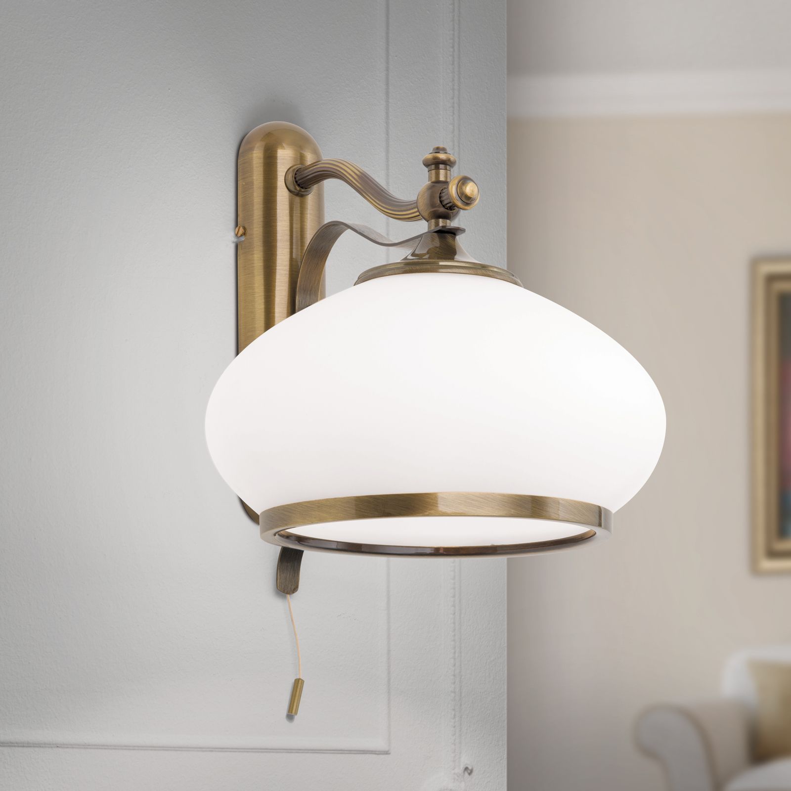 Die 1-flammige Wandleuchte aus der EMPIRE-Produktreihe ist ein handwerklich hervorragend gearbeitetes Kleinod. Der Landhausstil, dem sie verhaftet ist, wird hier sehr zurückhaltend ausgeformt. Der kunstvolle Schwung des Schirms wird an beiden Enden in Messing gefasst. Dezente Verzierungen am Schirmkopf laufen in zwei sanften Bögen zur geschmackvoll abgerundeten Leuchtenhalterung. Der matte Schirm streut das Licht warm und gleichmäßig in den Raum. Warum ein modernes oder Jugendstil-Ensemble nicht mit dieser Leuchte „aufmöbeln“? Die dimmbare Leuchte verfügt über eine E27-Fassung für maximal 60 Watt und einen Schalter.