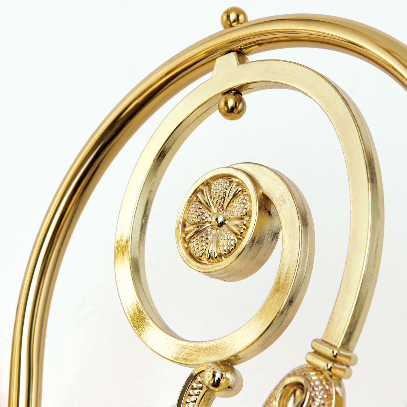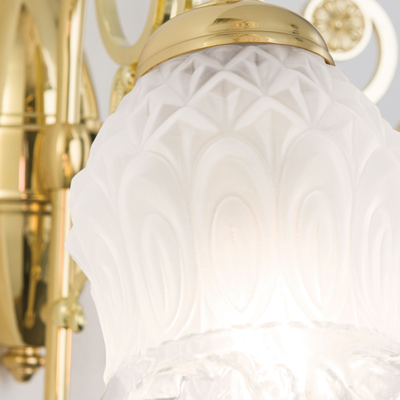 Egal, ob Sie sie im Wohnzimmer, im Flur oder im Schlafzimmer platzieren - die Wandleuchte RINGSTRASSE wird sicher bewundernde Blicke auf sich ziehen und eine warme, einladende Atmosphäre schaffen. Gönnen Sie sich das Luxusgefühl eines klassischen Stils mit dieser erlesenen Wandleuchte aus glänzend poliertem Messing und Blütenglas.
