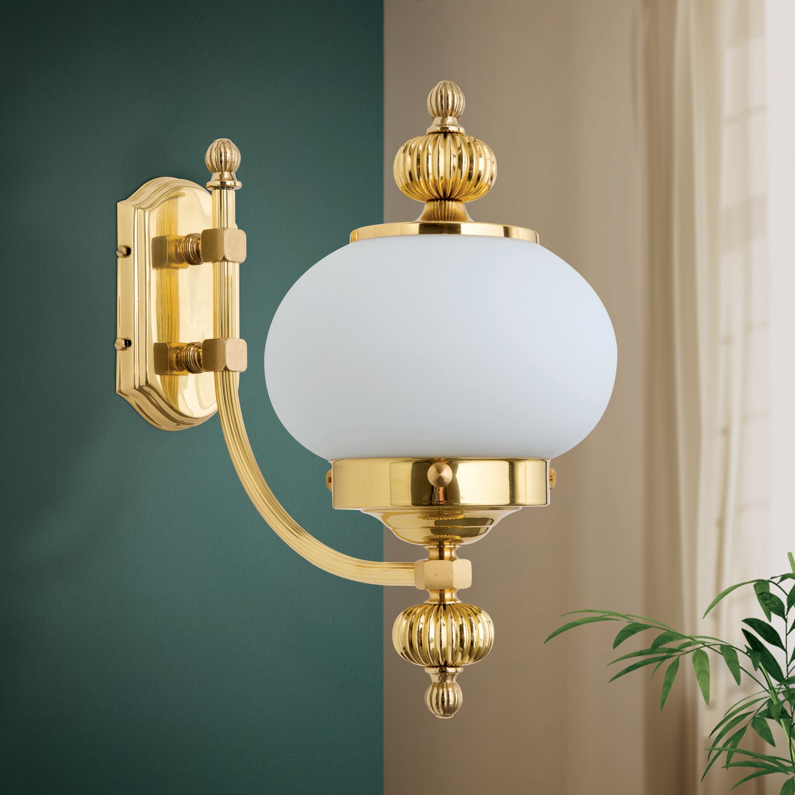 Wandleuchte WIENER NOSTALGIE, 1-flammig, Messing-glänzend, mit opal mattem Glas, aufwärts