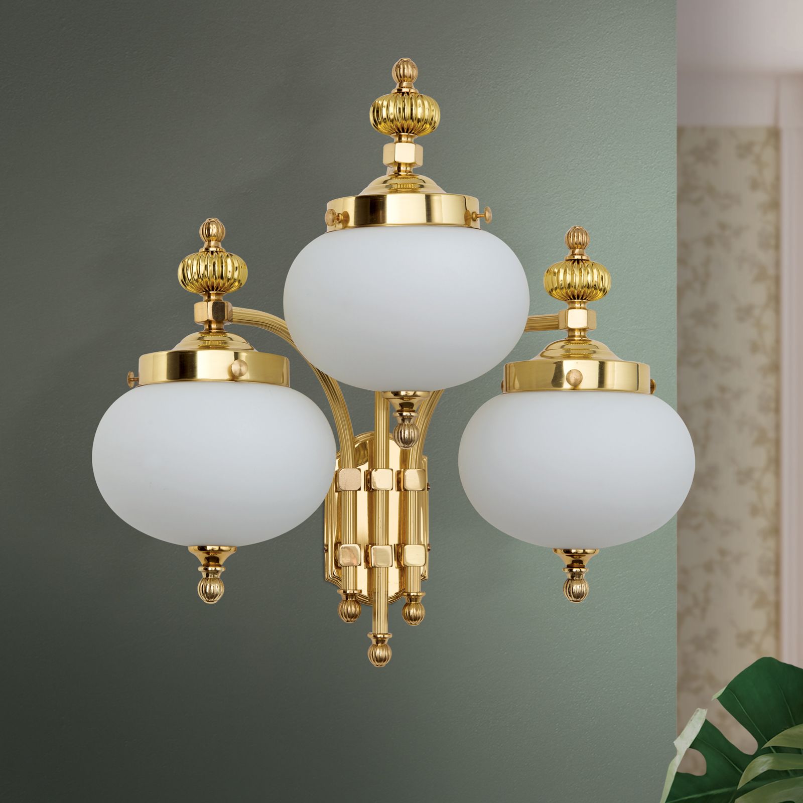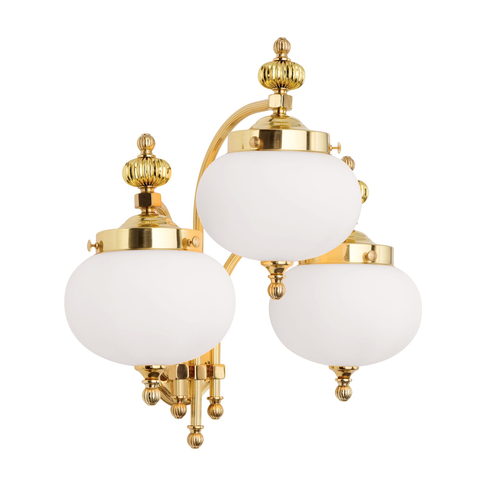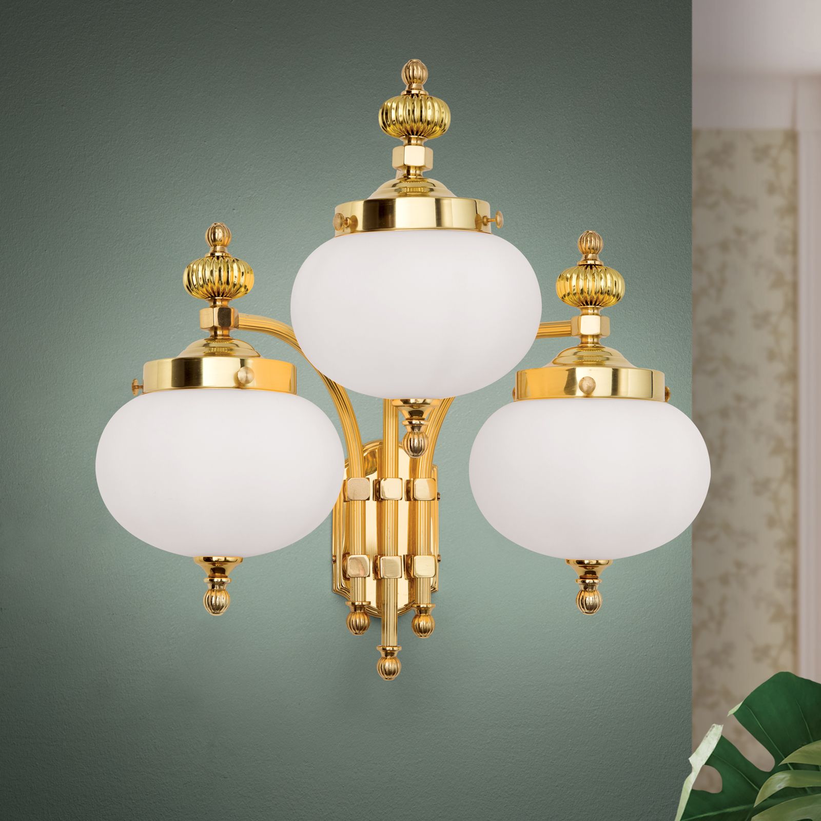 Wandleuchte WIENER NOSTALGIE, 3-flammig, Messing-glänzend, mit opal mattem Glas, abwärts